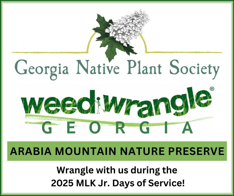Wrangle with us! Dekalb County and Intown Atlanta Chapter of GNPS are hosting a weed wrangle event on MLK Jr. Day of Service as a part of the statewide Weed Wrangle Georgia! Volunteers will engage in a rewarding morning of invasive plant removal at Davidson-Arabia Mountain Nature Preserve. Volunteers have two options depending on interest and physical ability: