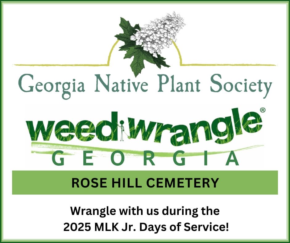 Wrangle with us! The Fringed Campion Chapter of GNPS, Rose Hill Cemetery Preservation Society and Historic Macon Foundation, and Macon-Bibb County are teaming up to host a weed wrangle event on MLK Jr. Day of Service as a part of the statewide Weed Wrangle Georgia! Volunteers will engage in a rewarding morning of invasive plant removal at Rose Hill Cemetery in Macon with crews at the Oak Ridge section and main section.