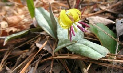 Dimpled trout lily (Erythronium umbilicatum) grows in shade to partial shade; does best in hardwood forest-like settings with rich soil and filtered light in spring; quick to establish in slightly moist areas and on creek banks. Transplanting tips: Plant, especially flower, quite fragile; bulb of mature (two leaf and flowering) specimen can be up to 18 inches deep...