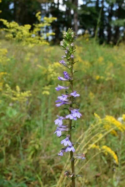 Downy Lobelia (Lobelia puberula) grows in sun to partial shade; prefers consistent moisture.