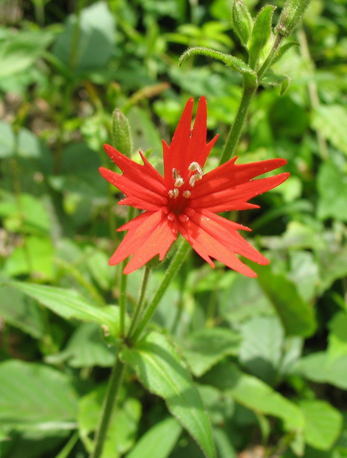 Fire pink (Silene virginica) grows in full sun to part shade, in dry to medium-wet soil conditions; prefers part shade; needs excellent drainage.