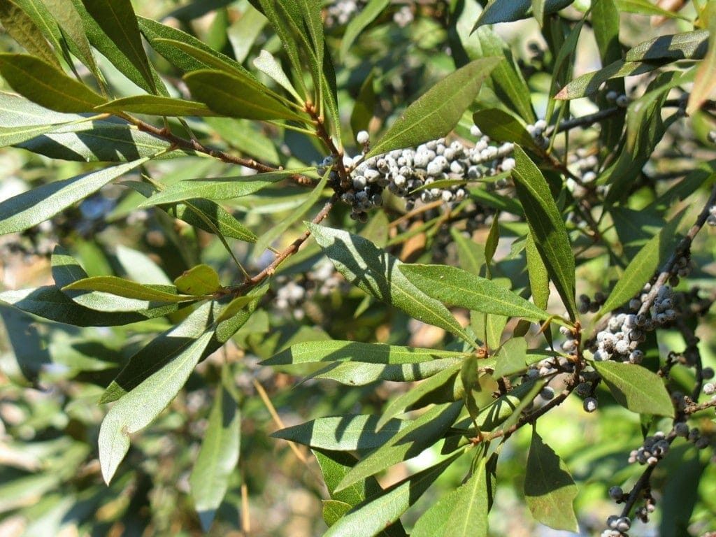 The wax myrtle is a member of the bayberry family, Myricaceae. You may know its botanical name as Myrica cerifera, however, it has recently been reclassified to the Morella genus. The narrow, evergreen leaves area glossy olive-green and are 2 to 4 inches long and 1/4 to 3/4 inches wide. They are quite aromatic when crushed, releasing a pleasant spicy scent.
