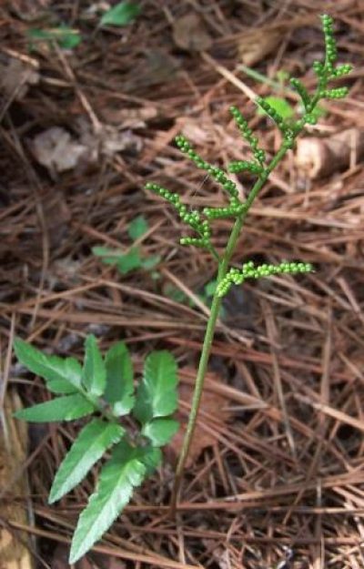 Southern grape fern sends up new frond in fall which then dies back in spring. Rattlesnake fern (Botrychium virginianum), which looks similar, comes up in spring and dies back in winter; its fertile frond is attached at the base of the sterile blade high above ground level. It turns a bronze color after frost unless covered by leaves.